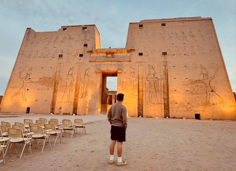 Sáng: Sau khi dùng bữa sáng, đoàn tham quan Đền thờ Adfu - Nơi thờ vị thần ánh sáng Horus vĩ đại. Horus là thiên thần của Ai Cập Cổ đại hóa thân là chim ưng. Mắt phải chim ưng là mắt của thần Horus, cũng được xem là tượng trưng cho Mặt Trời. Mắt trái tượng trưng cho Mặt Trăng và thần Tehuti.
