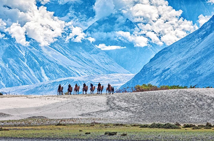 Từ Leh, con đường uốn lượn qua những đèo cao chạm mây đưa chúng ta đến thung lũng Nubra – nơi sa mạc cát trắng ôm trọn những dòng sông băng, và dãy Himalaya tuyết phủ sừng sững soi mình dưới nắng vàng. Mỗi khoảnh khắc ở đây đều như một bức tranh sống, khiến chúng ta muốn dừng lại thật lâu để hít đầy lồng ngực bầu không khí thuần khiết. Tất cả tạo nên một thế giới tách biệt, nơi thời gian như ngừng trôi để chúng ta chỉ còn nghe tiếng gió, tiếng nước và nhịp tim của chính mình.