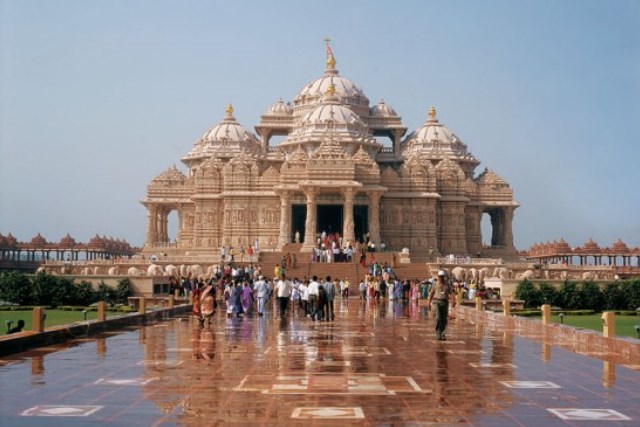 • Đền Akshardham – là ngôi đền được mệnh danh là bức tranh văn hóa vạn năm của xứ Ấn. ngôi đền Akshardham tọa lạc tại phía phía đông của thủ đô New Delhi, hàng  năm thu hút nhiều tín đồ Hindu giáo trên khắp thế giới tới hành hương. Tên gọi của ngôi đền Akshardham mang ý nghĩa là đời đời bình yên và cũng là nơi ở linh thiêng của Đấng tối cao được tất cả mọi người tôn thờ. Công trình được xây dựng bằng đá sa thạch màu hồng xứ Rajasthani và đá cẩm thạch màu trắng Carrara của Ý mang ý nghĩa tượng trưng cho sự tinh khiết tuyệt đối và hòa bình vĩnh cửu.
