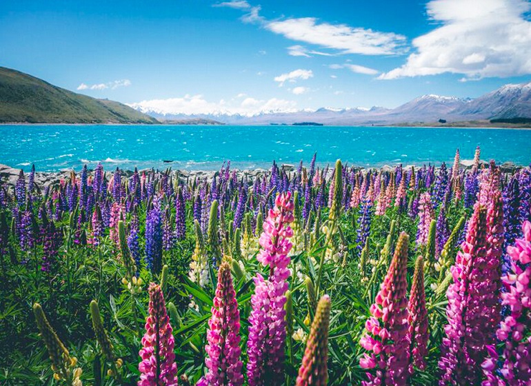 - Hồ Tekapo & Núi Cook: ngắm thảm hoa lupin rực rỡ (mùa nở), hồ nước xanh ngọc bích và dãy Southern Alps hùng vĩ.