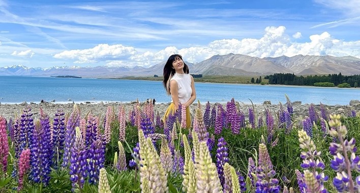 14:30 – Đến hồ Tekapo – viên ngọc xanh của đảo Nam. Mặt hồ long lanh màu ngọc bích, phản chiếu dãy Southern Alps phía xa. Đặc biệt: tại hồ Tekapo, New Zealand, hoa lupin nở rộ đẹp nhất từ giữa tháng 11 đến đầu tháng 1 hàng năm. Thời điểm tốt nhất để ngắm hoa là vào cuối tháng 11 hoặc đầu tháng 12, khi hoa bắt đầu nở rộ và phủ kín các sườn đồi xung quanh hồ, tạo nên khung cảnh rực rỡ sắc màu.